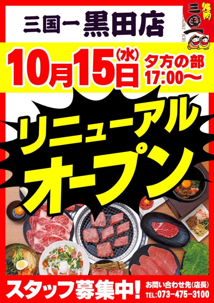焼肉三国一 黒田店 10/15(水)17:00~リニューアルオープンしました!